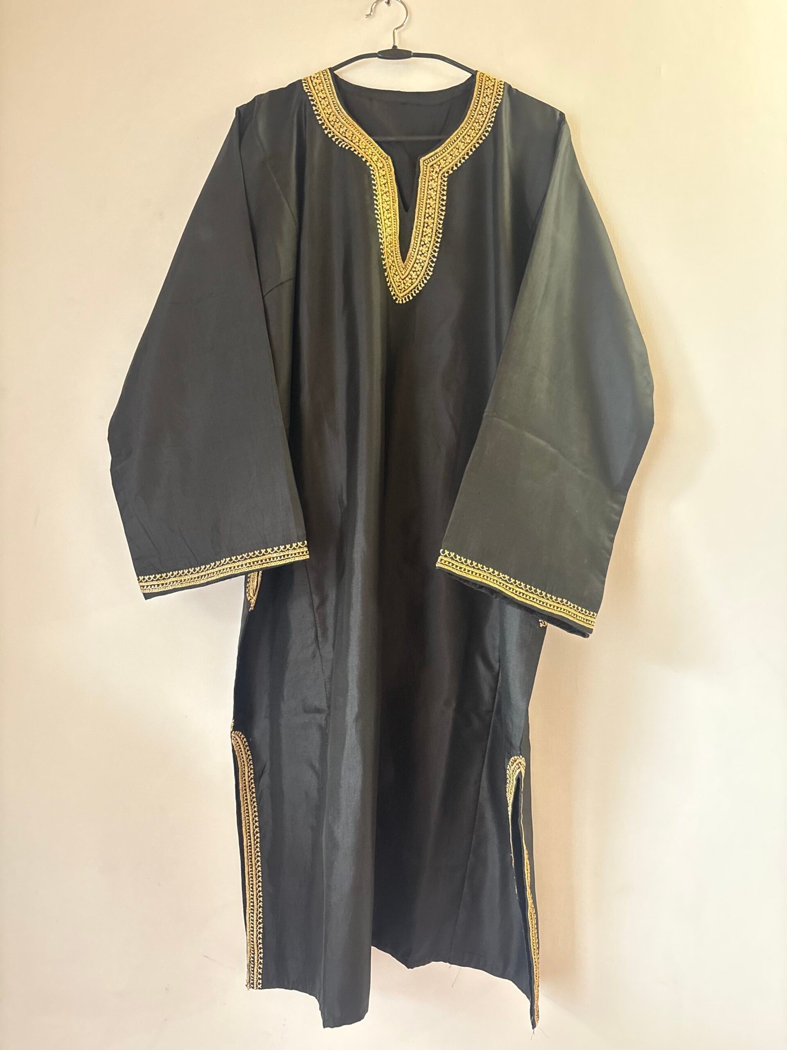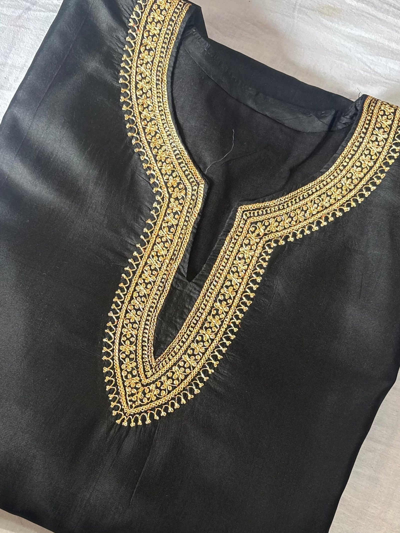 Embrace timeless luxury with our Pure Black Silk Stitched Pheran, adorned with exquisite Golden Tilla embroidery. Crafted to perfection, this piece beautifully captures the essence of Kashmiri elegance — a flawless blend of tradition and sophistication.