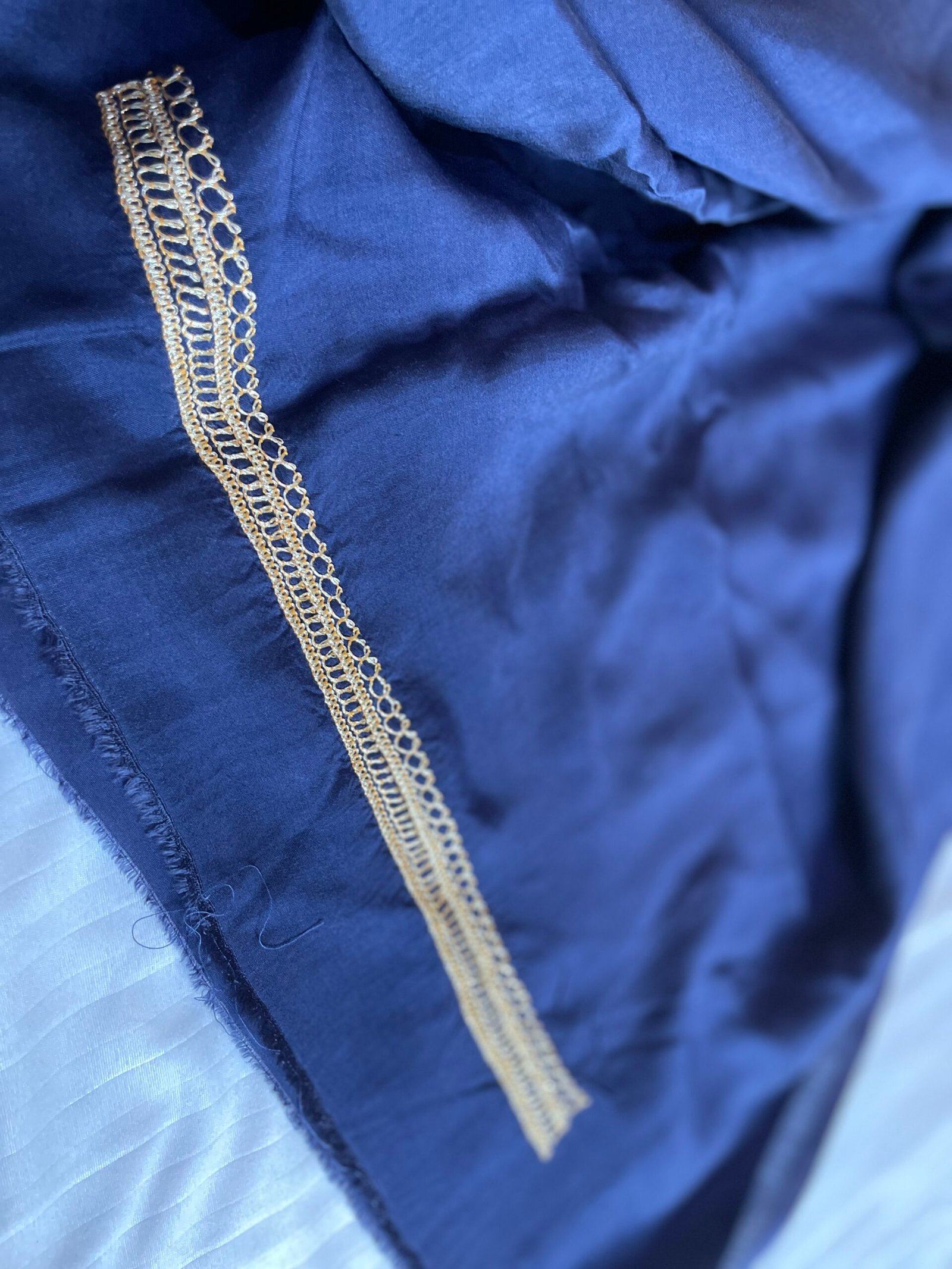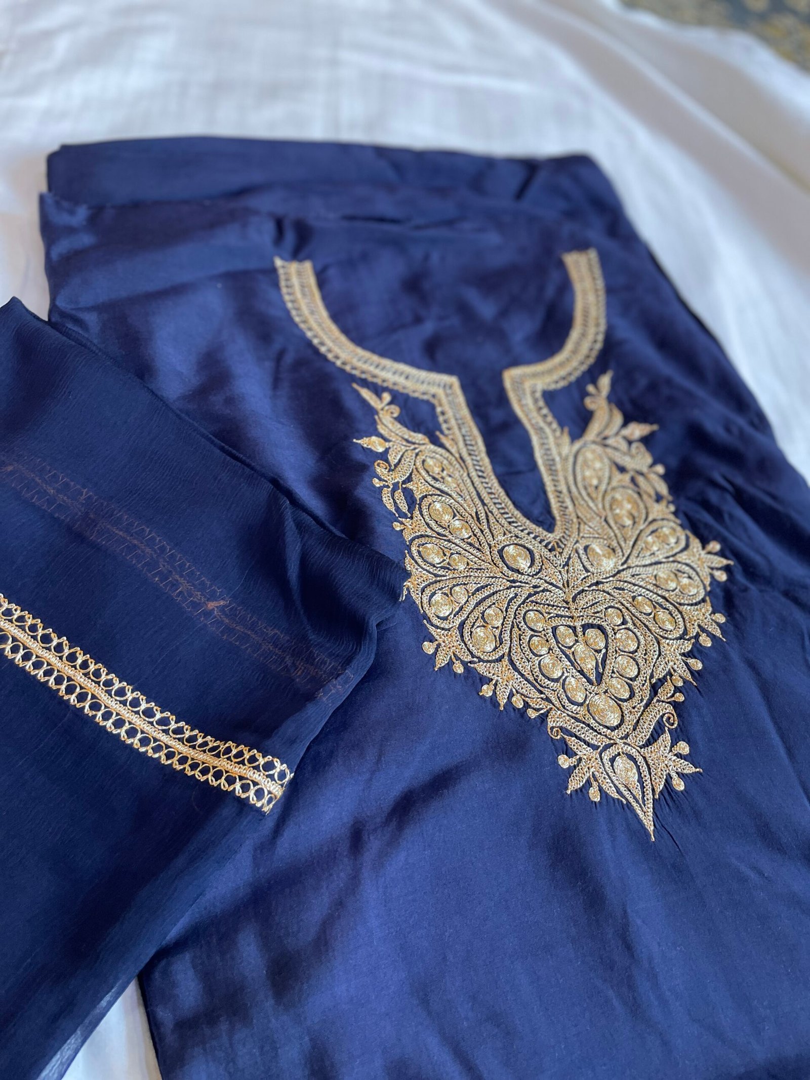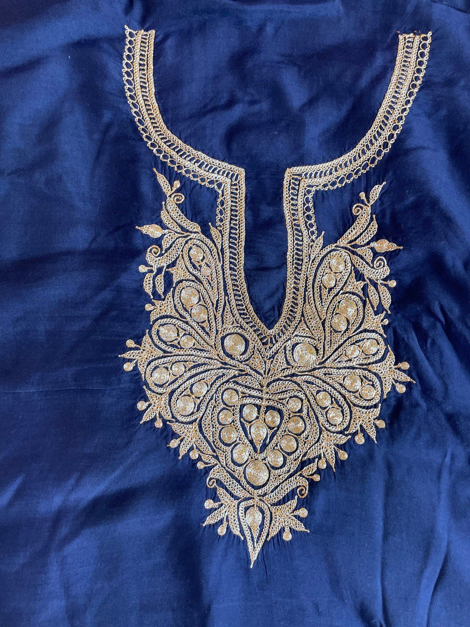 Deep midnight blue suit with bold golden tilla embroidery in a rich, heart-shaped neckline design. A striking piece that blends royal color with traditional Kashmiri craftsmanship