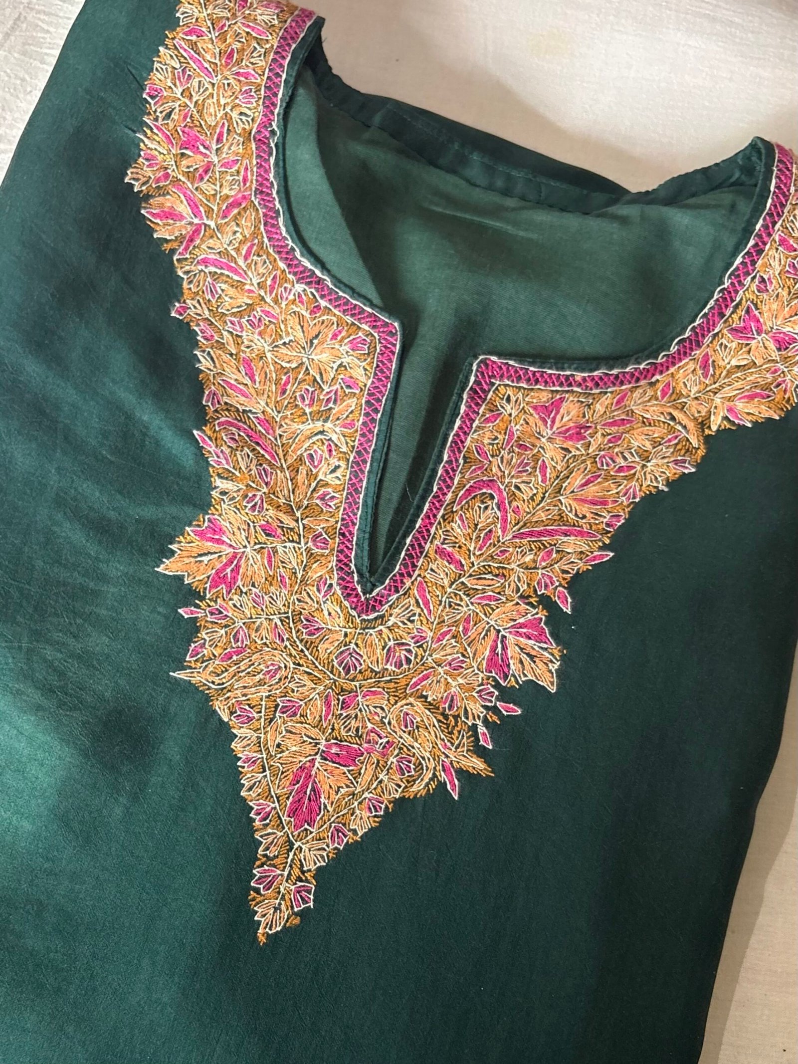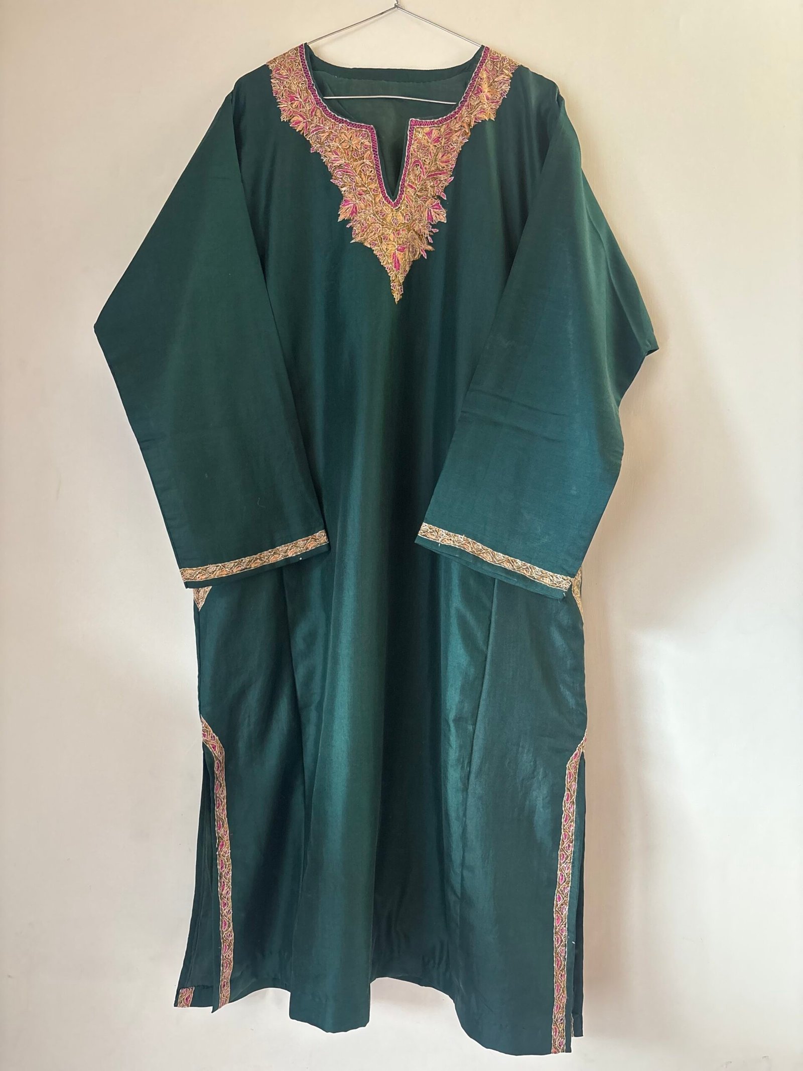 Be the first to review “Stitched bottle green pure silk pheran with thread work”